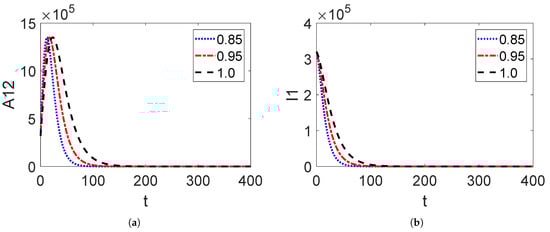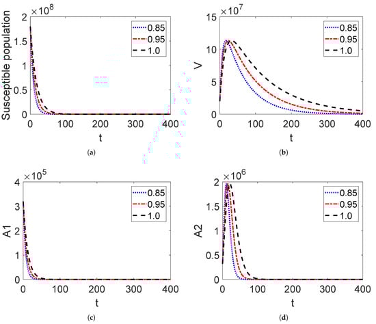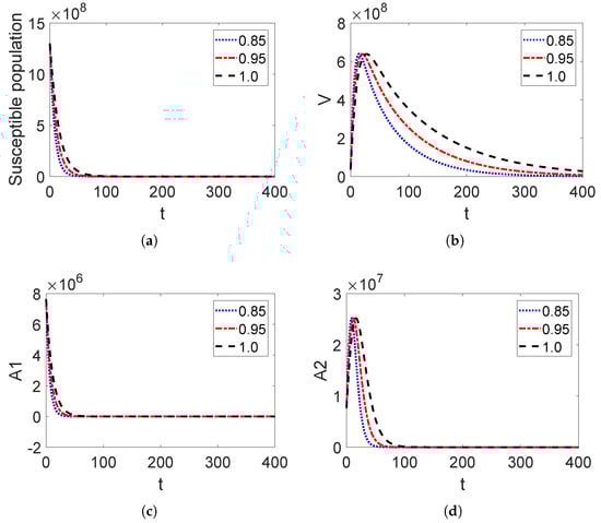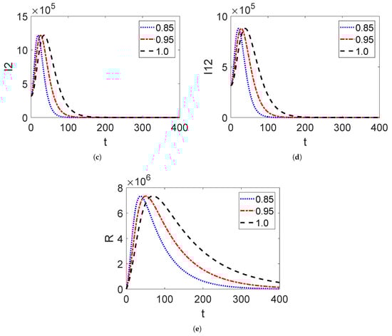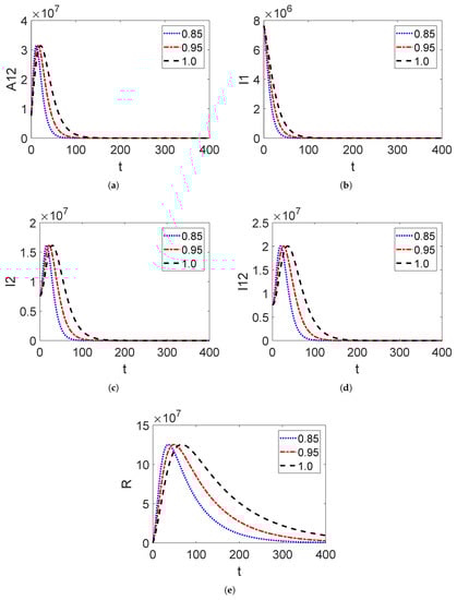 The simulation for Pakistan is depicted in Figure 3 and Figure 4. The number of susceptible people decreased over time since people were exposed to the coronavirus, which spread in a particular region in Figure 3a. The vaccination effect was also studied in the proposed model. When the vaccination ratio increased in India for the Delta variant, as observed in Figure 3b, as a result, the number of asymptomatic infected and symptomatic infected people decreased, which is displayed in Figure 3c and Figure 4b. This was due to vaccination leading to a stronger immune response against the Delta variant. There was no vaccination program against the Omicron variant. Therefore, the asymptomatic infected and symptomatic people infected with the Omicron variant increased, as shown in Figure 3d and Figure 4c. Likewise, as shown in Figure 4a,d, the number of coinfected asymptomatic and symptomatic people increased since there was no strategy to develop an immune response against the Omicron and Delta variants. Figure 4e denotes the recovered people, which increased with the passage of time. This happened because some people have naturally strong immunity and can fight off some diseases without taking medicine or vaccines.