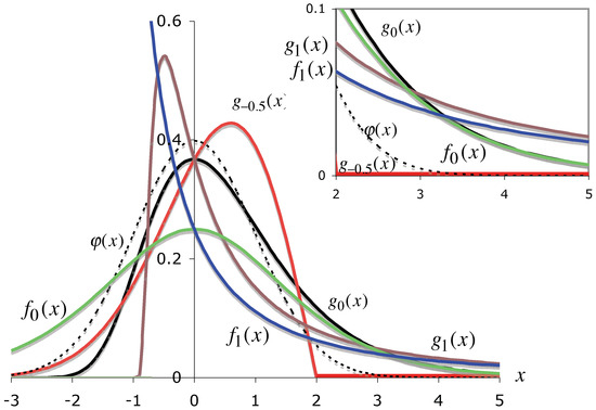 So, the PDFs of products and of OSs of IID standard uniforms in the above inequalities underbrackets are the PDFs of, respectively, , , , , and , and the corresponding positive exponents extensions are: