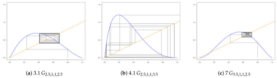 Section 4 is a preliminary presentation of two iconic population growth models, the Verhulst logistic model and the Gompertz model, and of their lattice counterparts, the logistic map and the Gompertz map . As is the first-order truncation of , we can view the logistic model as a first-order approximation of the Gompertz model. Hyper-logistic maps and hyper-Gompertz maps are natural extensions, and for appropriate values of the parameters, they are connected with Blumberg [16] and with Turner et al. [17,18] DE population models, respectively.
