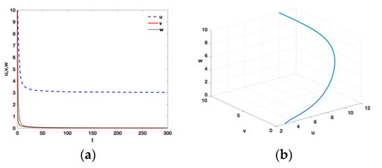 - According to Theorem 4, we take and , and there exists the tumor-free equilibrium . See Figure 2; is locally asymptotically stable and remains that the tumor is curable by ACI therapy and the external input of IL-2 into the model (Equation (1)).
