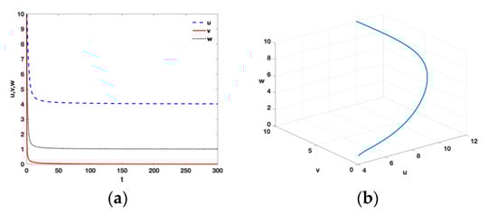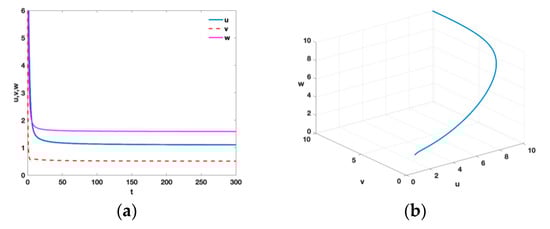 Figure 1. Time series (a) and phase diagram (b) of equilibrium point with , , , , , , , , , , and . - (ii)