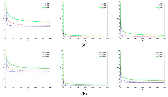- If , , and , there is and . When , it is known that , and . From the third equation of model (Equation (1)), we can derive and then with . The Mittag–Leffler function is and with []. We know that the Mittag–Leffler function is positive in [,,], then . By using the standard comparison theorem [,], we obtain for all , and , which contradicts the hypothesis. The same can be said for the following two cases: