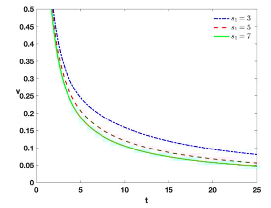 - When and , this refers to the injection of external effector cells to destroy the tumor cells. From Figure 4, it follows that as the speed of tumor elimination becomes larger, the value of becomes larger. However, as the number increases, the change becomes less and less obvious. Which means that there is also a critical value when the value is selected.