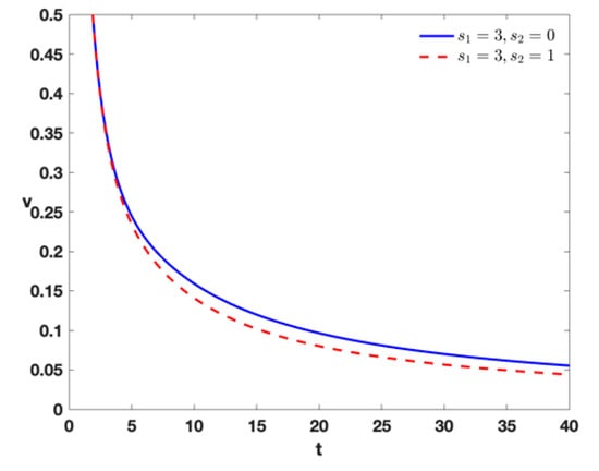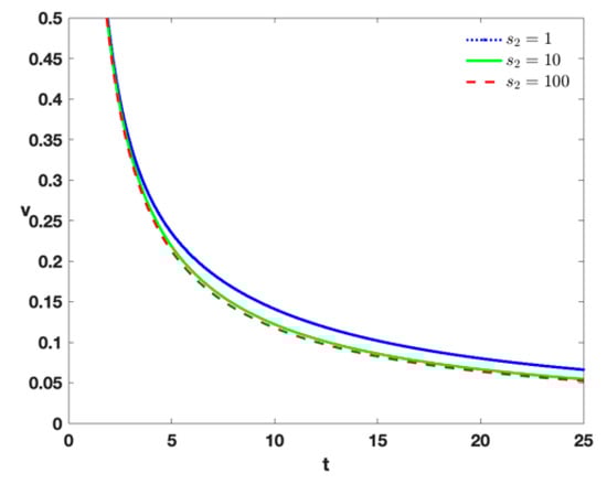 - In order to investigate the impact of external input of IL-2 into the model (Equation (1)) with different positive values, Figure 6 indicates that with a larger value of and the same value of , the speed of tumor extinction will be larger. Moreover, there is also a critical value when the value is selected.