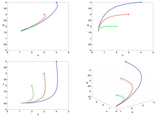 Figure 8. Phase diagram of equilibrium point with , , , , , , , , , , , and different initial conditions . The initial conditions of the blue, red and green lines are , and respectively. - (ix)