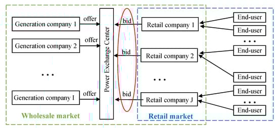 Generally, electricity markets include the wholesale market and the retail market from the viewpoint of the participants. Different products, e.g., power energy, regulation reserve, and spinning reserve, are traded in the market. In this paper, we focus on the bidding behaviors of the retail company in the wholesale market. The retail company buys electricity from the wholesale market and sells it to the end-users in the retail market to earn the price difference, as shown in Figure 1.
