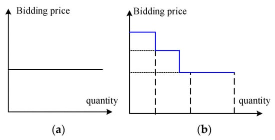 The retail company often has options to bid a single price and a demand quantity (under the 1-segment bidding rule) or a multi-segment price–quantity curve (under a multi-segment bidding rule) in the wholesale market. Bidding rules vary in different markets around the world, and the number of segments can be one (Jiangsu, China), three (Guangdong, China), six (Zhejiang, China), or ten (Australia [] and PJM, U.S. []). Under a multi-segment bidding rule, the bidding quantity can be divided into several segments, and bidding prices are monotonically decreasing for each segment, as shown in Figure 2. The market operator will clean the market according to the bidding quantities and prices from all the participants, while the retail companies with higher bidding prices will have higher priorities to be cleared.