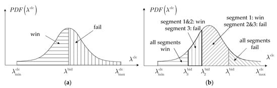 Note that the above analysis is based on the 1-segment bidding rule. If the market implements the N-segment bidding rule, the actual bidding result of the retail company will consist of N + 1 conditions. For example, Figure 3b presents the bidding results under the 3-segment bidding rule, and four conditions might occur. If the bidding prices of all segments are higher or equal to the market clearing price (), all segments win the bidding; if , the 1st and 2nd segments win and the 3rd one fails; if , the 1st segment wins and the 2nd and 3rd ones fail; and if , all segments fail.