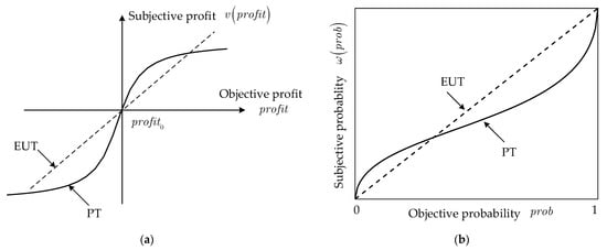 Traditionally, the expected utility theory (EUT) and classical prospect theory (PT) have been widely used to study the decision making of the participants in the electricity market. The EUT value is the expected profit of each condition, as shown in (4). As EUT assumes that the participants bid rationally but the actual decision-making behaviors are found to often deviate from the EUT under risk conditions, the classical prospect theory (PT) was proposed [], as given in (5). Following the PT theory, people use their subjective values and probabilities rather than the actual ones to evaluate the possible outcomes, in which the summations of the productions of the subjective values and probabilities of all conditions is the PT value. The general formulas of the subjective probabilities and values are typically shown as (6) and (7), respectively [], and the typical shapes of these two functions are illustrated in Figure 4.