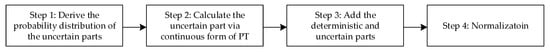 To address this issue, we modified the classical PT into a fractional PT to make it suitable for the piecewise function with partial uncertainties, while the basic idea is following the modified PT for continuous distributions [,]. Specifically, the overall function is divided into two parts: the uncertain part and the deterministic part. The uncertain part refers to the value function including uncertain variables, while the deterministic part refers to the totally deterministic part. The deterministic and uncertain parts are calculated separately and then added up with normalization. Finally, the proposed FPT method consists of four steps, as shown in Figure 5.