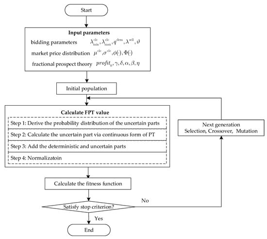 In the FPT-based optimal bidding model, the objective function is a fractional function with integrals, and the integrand function includes probability distribution functions concerning the decision variables. Therefore, it is challenging to solve it analytically. To address this problem, we used a genetic algorithm (GA) [] to solve this problem. The flow chart of the method for solving the proposed model is given in Figure 6, and the main parameters are given in Table 2.