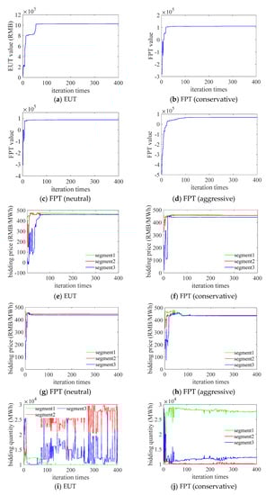 Table 5 presents the optimized results with the EUT-based and FPT-based methods under the 3-segment bidding rule. In the uniform pricing market, the optimal strategy for the rational bidder with the EUT-based method is to bid the same price (CNY 460.0/MWh) for all three segments, which is the same as the one under the 1-segment bidding rule. However, it is obvious that such a result significantly deviates from the realized data in the actual markets. For example, the Australian Energy Market (AEM) [] and PJM (Pennsylvania–New Jersey–Maryland Interconnection) market in the U.S. [] offer some historical bidding data to the public. From the actual data, it can be seen that most participants will not bid the same prices for different segments. Therefore, it is significantly necessary to consider the psychological factors in the bidding model. Meanwhile, because the bidding prices of the three segments are the same for the EUT-based method, the optimal solution of the bidding quantities is not unique.