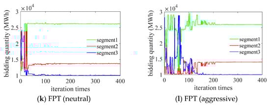 Objective function values, bidding prices, and bidding quantities during GA iterations under the 3-segment rule: (a) objective function value of EUT; (b) objective function value of FPT (conservative); (c) objective function value of FPT (neutral); (d) objective function value of FPT (aggressive) (e) prices of EUT; (f) prices of FPT (conservative); (g) prices of FPT (neutral); (h) prices of FPT (aggressive); (i) quantities of EUT; (j) quantities of FPT (conservative); (k) quantities of FPT (neutral); (l) quantities of FPT (aggressive).