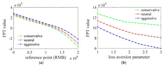 Figure 8 presents how the FPT value changed with the studied parameters. The results show that the FPT value decreased as the reference point increased and the loss aversion parameter increased. Specifically, with the increase of the reference point, it gets harder for the objective profit to reach the subjective profit aim (reference point). As a result, the distortion effect on the subjective value function, especially for the negative parts (), was more dominant in the FPT value function, and thus the FPT value continuously decreased. Comparing the results between the conservative, neutral, and aggressive strategies, it can be seen that when their reference points were the same, the conservative one had the lowest FPT value because its loss aversion parameter was the largest. As the reference point increased, the negative part occupies more of the FPT function, and thus the gaps between the three curves in Figure 8a also increased. Figure 8b shows that with the increase of the loss aversion parameter, the FPT value continuously decreased because the negative parts in the subjective value function decreased. Meanwhile, the gaps between the three curves increased as the loss aversion parameter increased in Figure 8b due to similar reasons as in Figure 8a.