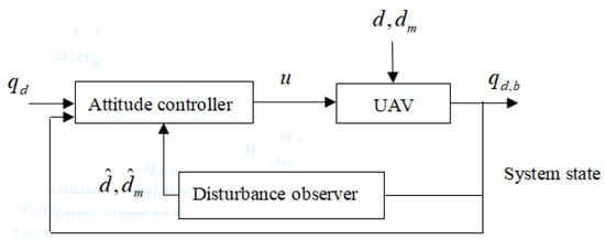 The objective of this paper is to design a controller based on the new reaching rate, aiming at a quadrotor UAV model with mismatched disturbances, so that the output qd,b of the system can track the given input command qd; the disturbance observer estimates the mismatched disturbances dm and matched disturbances d, and the corresponding outputs are the estimated values and , as shown in Figure 1.