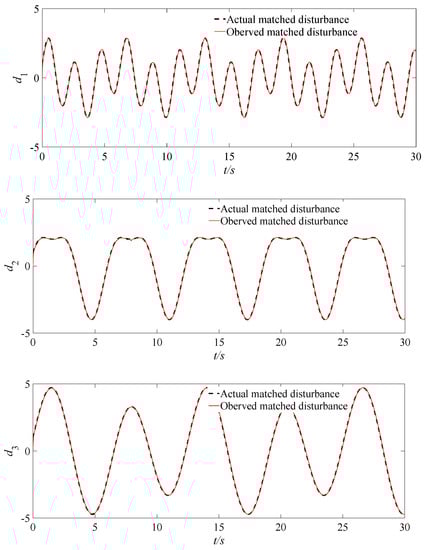 As shown in Figure 2 and Figure 3, the disturbance observer can quickly and accurately track the actual mismatched disturbances dm and d, respectively, after short fluctuations. The estimated errors of the disturbances are also very small, which can suppress the disturbance effects on the control system; therefore, the quadrotor UAV attitude control system is less affected by disturbances.