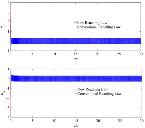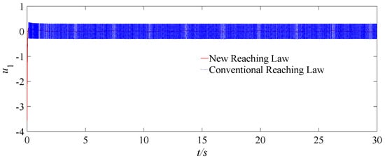 Under the same conditions, the simulation experiments are conducted for a UAV system by using a new reaching law and a conventional reaching law, as shown in Equations (6) and (5), respectively. The corresponding controller angle response results are shown in Figure 4. It can be seen that the chattering amplitude applied by the new reaching law is significantly reduced compared to that of the conventional reaching law, and the sigmoid function is adopted to effectively suppress the chattering of the controller.