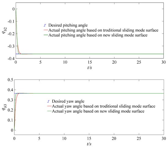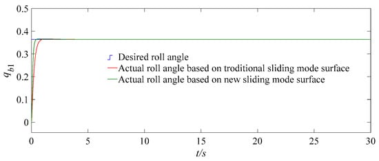 Then traditional and proposed controllers are used for the attitude system of the quadrotor UAV. The traditional control law adopting the traditional backstepping sliding mode surface is shown in Equation (26). The controller using the new sliding mode surface is shown in Equation (21). The two controllers use the same parameters and select the design parameters c1 = 0.4, c2 = 1, c3 =3, l1 = 0.056, k = 1, L = diag{20, 20, 20} and h = 20.