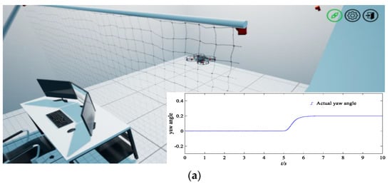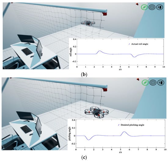 Flight simulation experiments of a quadrotor UAV and the tracking curves of yaw angle, roll angle, and pitching angle. (a) The initial stage of the quadrotor UAV and tracking responses of an actual yaw angle. (b) The quadrotor UAV in flight, and the tracking responses of an actual roll angle. (c) The final stage approaching the target, and tracking responses of an actual pitching angle.