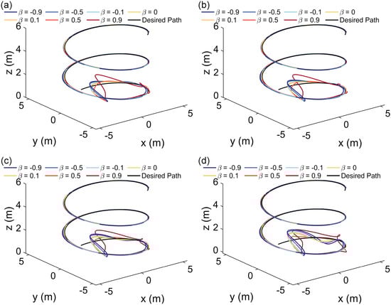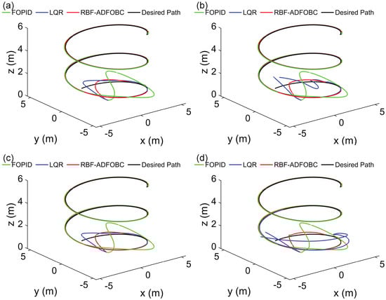 In the previous section, the simulation results of the RBF-ADFOBC with seven fractional orders have been compared, revealing that the RBF-ADFOBC with β = 0.5 (or β = 0.1) can demonstrate the best path tracking accuracy and robustness to modeling uncertainties and input time delays. In this section, the RBF-ADFOBC approach is further compared with two previous controllers to highlight the effectiveness and robustness of our RBF-ADFOBC approach. The two previous controllers include a fractional-order PID (FOPID) controller with its five parameters optimized via the particle swarm optimization (PSO) algorithm [], and a linear quadratic regulator (LQR) controller []. The FOPID controller (or the LQR controller) is employed in the inner loop responsible for attitude control, as well as the outer loop tasked with position control of the quadrotor system. The transfer function of the FOPID controller is given as: