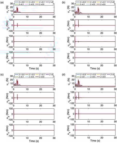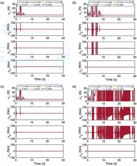 Simulated control inputs of the varying fractional orders in the proposed controller to uncertainty in the quadrotor dynamics with various payloads and uncertain input time delays: (a) m/s2 and s, (b) m/s2 and s, (c) m/s2 and s, (d) m/s2 and s. (Assume that and .)
