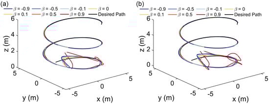 From Equations (68) and (69), we can easily find that the trajectory-tracking error can be driven to an arbitrarily small neighborhood of the origin by properly choosing the selectable parameter values. This completes our proof. □