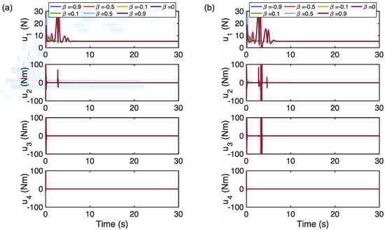 Subsequently, Figure 8 demonstrates the control signals of the proposed RBF-ADFOBC controller in response to varying fractional orders and the presence of input delays and external payloads. Table 14, Table 15, Table 16 and Table 17 provide the root mean squared values of the control signals during the initial 30 s. The results reveal that the control input tends to increase with increasing fractional order and reaches its global peak at , which is a similar consequence as the previous two sets of numerical simulations. Nonetheless, it is crucial to note that when the quadrotor is subject to a payload of 2 m/s2 and an input delay of 0.10 s, the control signal at experiences an explosion, leading to the destabilization of the closed-loop system.