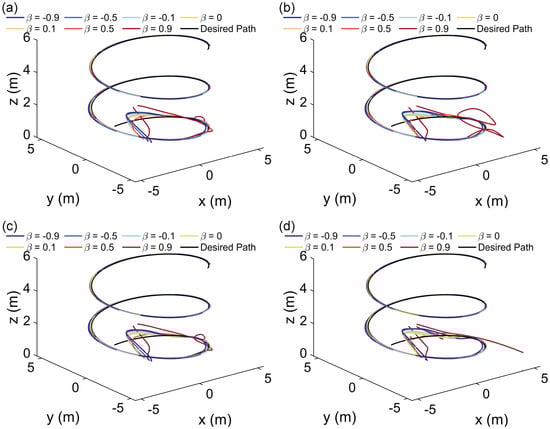 Comparison of the simulated trajectories with three controllers ( in RBF-ADFOBC) in response to various payloads and uncertain input time delays: (a) m/s2 and s, (b) m/s2 and s, (c) m/s2 and s, (d) m/s2 and s. (Assume that and .)