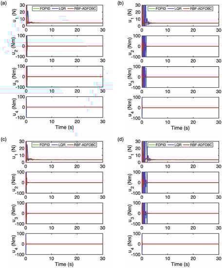 Comparison of the simulated control signals with three controllers ( in RBF-ADFOBC) in response to various payloads and uncertain input time delays: (a) m/s2 and s, (b) m/s2 and s, (c) m/s2 and s, (d) m/s2 and s. (Assume that and .)