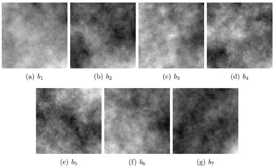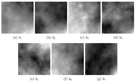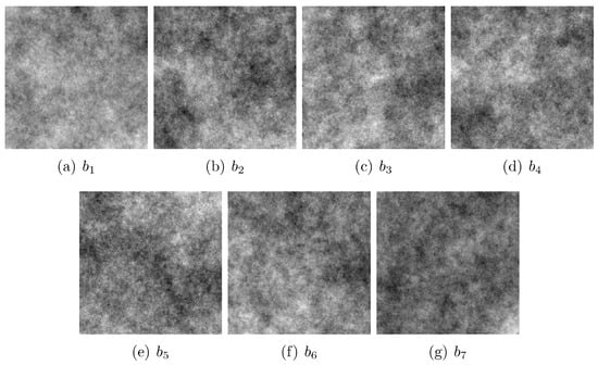 Considering the conclusion in [3], one can extend the proposed approach for the generation of color fractal images to the domain of multi-spectral and perhaps even hyper-spectral fractal images. Consequently, in this paper, we embrace the midpoint displacement algorithm for generating fractal images based on the fractional Brownian motion model. We generated three multi-spectral images of different generated complexities: low generated complexity (), medium generated complexity (), and high generated complexity (). For each of the three complexities, we generated seven statistically independent fractal images using the midpoint displacement approach [2], with each of them corresponding to a wavelength or band in the resulting synthetic multi-spectral image. For the three synthetic fractal multi-spectral images, we chose the following seven wavelengths for the corresponding spectral bands: 450, 500, 550, 600, 650, and 700 nm, all of which are in the visible spectrum. The choice of the wavelengths was completely arbitrary and was performed solely for visualization purposes. In Figure 1, Figure 2 and Figure 3, from (a) to (g), we depict the seven spectral bands () of each of the three generated multi-spectral images. The random seeds used in the generation process were the same for the three multi-spectral images in order to generate similar terrain for the corresponding bands.