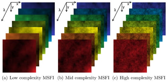 In Figure 4, we show the resulting data cubes for the three generated multi-spectral fractal images (MSFIs) with seven spectral bands. Note that the pseudo coloring of each spectral band channel is used to illustrate the approximate position of the corresponding wavelength on the lambda axis and does not necessarily represent the actual color corresponding to the exact wavelength.