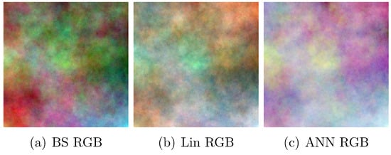 For each multi-spectral image previously generated, we show in Figure 5, Figure 6 and Figure 7a the color RGB image obtained by using the band selection technique. The wavelengths of 650, 550, and 450 nm were chosen for the R, G, and B channels, respectively, in order to produce the color RGB rendering of the corresponding multi-spectral images. However, displaying a multi-spectral image poses the problem of reducing the potentially large number of bands to just three color RGB channels in order to render the resulting RGB color image on a computer monitor while ensuring that the displayed information was meaningful from the user’s point of view. In Figure 5, Figure 6 and Figure 7b,c, we depict the RGB color images obtained using the linear model and the artificial neural network approaches proposed in [36], respectively. One can observe noticeable differences between the three types of visualization results (including the band selection approach). One reason for this is that the different visualization techniques tend to produce different results, as one can observe in [36]. Another reason is that the resulting multi-spectral pixel values in the generated synthetic fractal images had high variability due to the randomness in the generation mechanism and the statistical independence between bands, which was more than the variability of a natural spectral signature, resulting in the acquisition process of a real scene. Last but not least, in all three cases, the original information, which was richer, was reduced to less information (the dimensionality reduction was from seven spectral bands to only three), and thus more than half of the information was lost in the process of rendering the color RGB composite image.