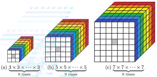 We embraced the approach in [27], which allows extending the classical probabilistic box-counting from three color channels to theoretically any number of spectral bands. In order to compute the measure required for the fractal dimension estimation, one has to adopt the analysis boxes for the multi-spectral case. In Figure 8, we show the multi-spectral boxes of sizes , , and for the case of multi-spectral images with two spatial coordinates and spectral bands.