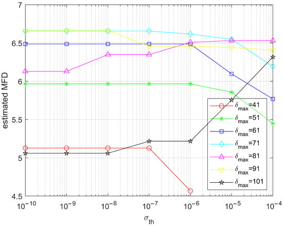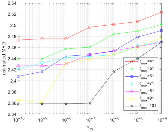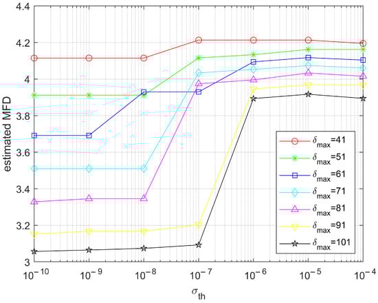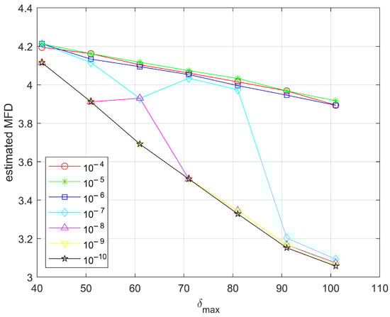 In order to graphically observe the evolution of the estimated multi-spectral fractal dimension, we present the corresponding plots in Figure 10, Figure 11 and Figure 12 (the evolution as a function of ) and Figure 13, Figure 14 and Figure 15 (the evolution as a function of ) for the low, medium and high complexities, respectively, for the common interval of parameter values ( from 41 to 101 and from to ). As a general observation, for the low- and mid-complexity images, the tendency of the estimated multi-spectral fractal dimension was to decrease with the increase in the maximum analysis window and the increase in precision for the agreement of regression line estimators (decrease in the standard deviation). However, this behavior was observed outside the most pertinent interval of values for . A possible explanation for the low performance of the estimator for large values of the maximum analysis box size is the less statistically significant data deployed in the regression line estimation as a consequence of the smaller effective image area for which the fractal analysis was performed (for , approximately 37% of the pixels of the generated images were disregarded). If the image’s spatial resolution (i.e., the image size) allows it, increasing the size of the maximum analysis box makes sense, given that the current estimator disregards the small boxes and allocates more weight to the larger boxes, especially for the high generated complexity fractal images, where the variations of the signals can be very important and thus need to adapt the maximum analysis window. For the high generated complexity image in our experiments, the variation of the analysis box size showed that the middle range of values was the most pertinent one for the estimation. For the appropriate values of , increasing the precision of the slope agreement in the regression line estimators (thus diminishing the standard deviation) clearly improved the estimation, as the estimated multi-spectral fractal dimension increased.