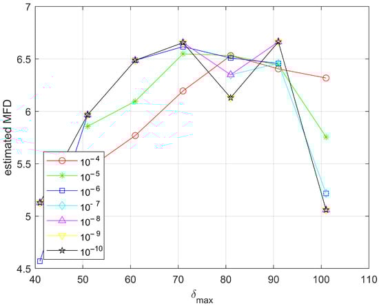 The estimated multi-spectral fractal dimension as a function of for the high generated complexity () multi-spectral fractal image.