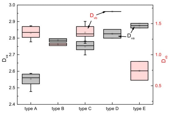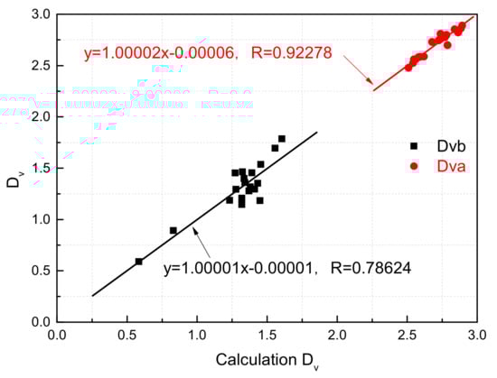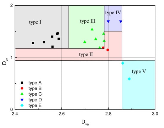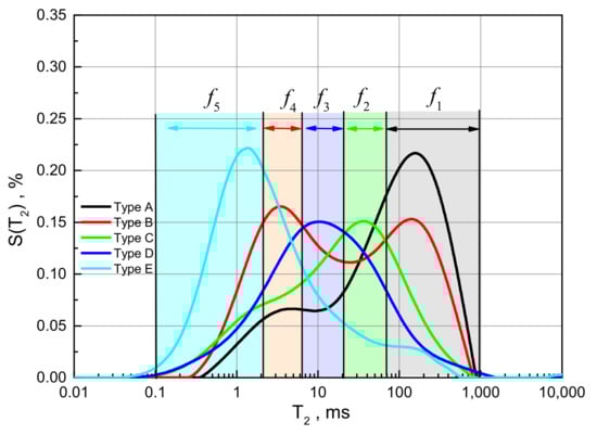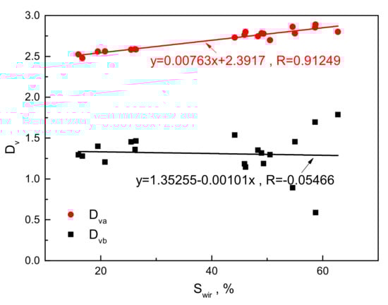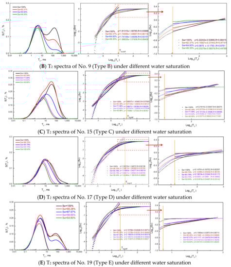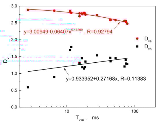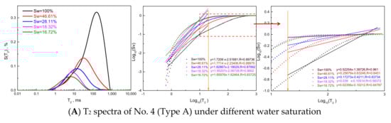 - To analyze the relationship between pore size and the fractal dimension from NMR, pore size is divided into five types according to T2 spectra ranges, including (T2 range of 70–900 ms), (T2 range of 20–70 ms), (T2 range of 5–20 ms), (T2 range of 2–5 ms), and (T2 range of 0.1–2 ms). The fractal dimension is inversely proportional to and , increasing and which are occupied by the movable water, leading to decreasing bound water content and fractal dimension . The fractal dimension is in inverse ratio to and , while it is in direct ratio to , increasing and results in decreasing fractal dimension , but increasing leads to increasing fractal dimension ;