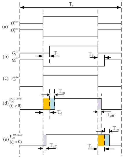 In practice, a dead-time, , is inserted in the gating signals to guarantee the safety of the VSI system. The gating signals with the dead time added are shown in Figure 2b. During the dead-time period , the switches in Figure 1 are turned off, and the terminal voltage is determined by the direction of the a-phase current [22]. Figure 2c is the ideal terminal voltage. Considering the dead time and the turn ON/OFF delay, the terminal voltage is illustrated in Figure 2d,e. In this case, the a-phase average terminal voltage error over one PWM period can be given as