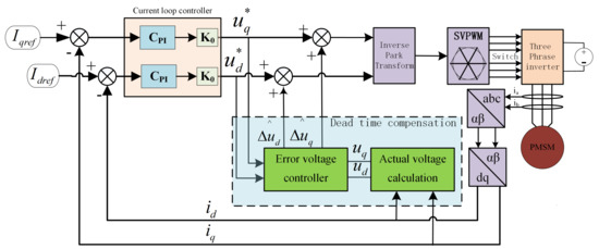 where and represent the d-axis and q-axis reference voltage of the PWM period and and represent d-axis and q-axis error voltages caused by dead-time effect.