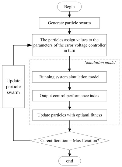 Due to its simplicity and ease of implementation with only a few parameters, the particle swarm optimization (PSO) algorithm has shown desired optimization performance in continuous optimization problems, and discrete optimization problems [24,25,26]. Because of the non-linear characteristics of the dead-time effect, it is challenging to use frequency domain analysis to design the parameters of the error voltage controller. In this paper, the improved PSO algorithm is presented to develop the parameters of the error voltage controller, and the process is shown in Figure 7.