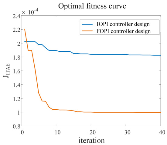 Based on the configuration in Table 1, the parameters of the FOPI controller are optimized using the PSO algorithm. The convergence curve of the optimal fitness function value with the number of iterations is shown in Figure 8.