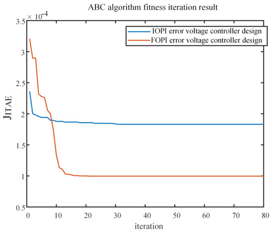 For the parameter design of the IOPI/FOPI controller, the parameter optimization curve of the ABC algorithm is shown in Figure 9 [27]. The comparison of the iterative optimization results of the ABC algorithm and the PSO algorithm is shown in Table 3, it can be seen that the optimal fitness values obtained by the two algorithms are approximately equal, which proves that the controller parameters obtained in Table 2 are the global optimal solution. Compared with the ABC algorithms, the improved PSO algorithm can achieve a faster convergence speed in the error voltage controller parameter design.
