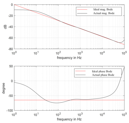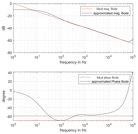 The is the fractional order of the d-axis FOPI error voltage controller. According to Table 2, = 0.651. The discrete implementation of can be obtained using the impulse response invariance method [23], and the comparison of discretization approximate bode graph and ideal bode graph is shown in Figure 10. The is the fractional order of the q-axis FOPI error voltage controller, and the comparison of discretization approximate bode graph and ideal bode graph of is shown in Figure 11.
