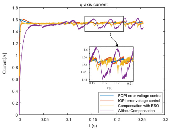 The experimental comparison results of the current step response are shown in Figure 25 and Table 9. The current step response without compensation has the characteristics of a slow rise time and large ripple. Compared with the IOPI error voltage controller and the compensation with ESO [14], it can be seen that the method with optimal FOPI error voltage control can further improve the tracking performance and reduce the current ripple of the current. Compared with the compensation with ESO [14], the optimal FOPI error voltage control can effectively suppress high-frequency harmonic disturbance.