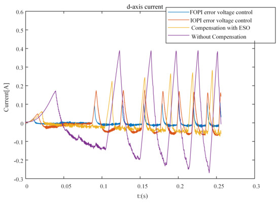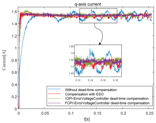 The methods based on model observation use a disturbance observer to estimate error voltages [14,15,16], Furthermore, it not only reduces the sixth harmonic as in many other compensation methods but also deals with its multiples concurrently. In [15], this paper introduces a current harmonic elimination method based on a disturbance observer (DOB), Although the DOB was shown to be able to satisfactorily operate under a constant change in the rotational speed of the machine, this method has not been verified for the dynamic response performance during motor startup. In [17], the expression of the inverter input current was derived by considering the deadtime effect. However, these models are not suitable for closed-loop control systems such as VSI-fed field-oriented control (FOC) PMSM servo systems. The control scheme using two extended state observers (ESO) is proposed in [14], which provides a strong ability to suppress dead-time effects, but the effect of this method can be further improved. In the following, the method using ESO [14] is compared with the method proposed in this paper.