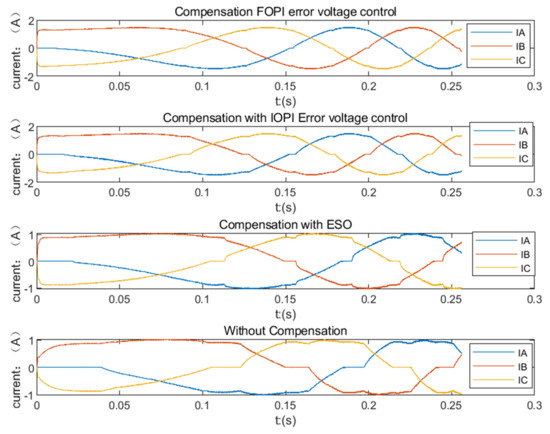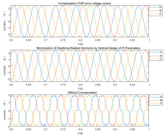 In the experimental results, the current response is compared under the three control strategies in Figure 26 and Table 10. Compared with the method without compensation, the dead-time compensation method with optimal IOPI error voltage control and the compensation method with ESO [14] can significantly reduce the current disturbance caused by the dead-time effect. The method with optimal FOPI error voltage control can further reduce the ripple of the current than the method with optimal IOPI error voltage control and the compensation method with ESO [14].