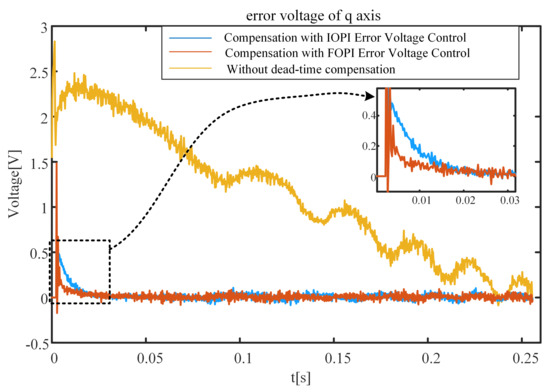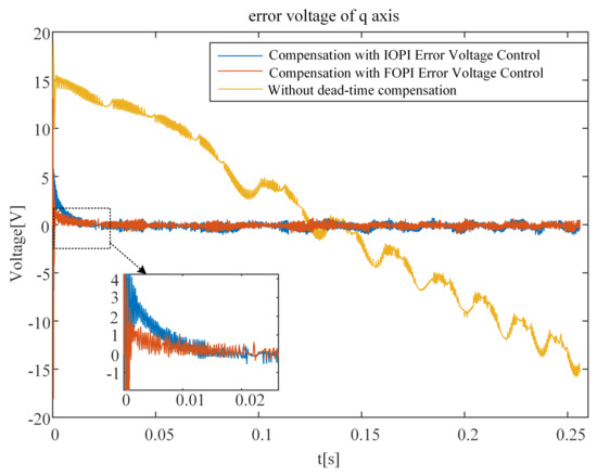 The q-axis error voltage simulation results are shown in Figure 16. The q-axis error voltage varies nonlinearly with increasing speed when using the method without compensation. The dead-time compensation method with optimal FOPI error voltage control can quickly make the error voltage converge to 0. The convergence speed of the proposed method is faster than that of the method using optimal IOPI error voltage control. The method with optimal FOPI error voltage control makes the q-axis error voltage converge to 0 faster than the method with optimal IOPI error voltage control.