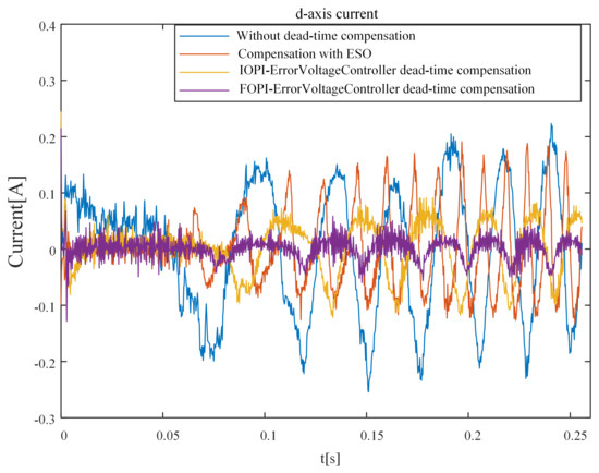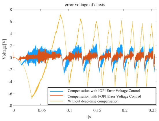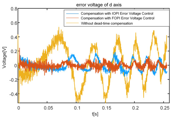 The experimental results of the d-axis voltage error are shown in Figure 27. It can be seen that the d-axis error voltage fluctuates violently under the influence of the dead-time effect. Compared with the method without compensation and optimal IOPI error voltage control, the dead-time compensation method with optimal FOPI error voltage control can significantly reduce the d-axis error voltage.