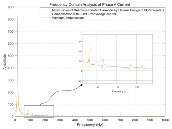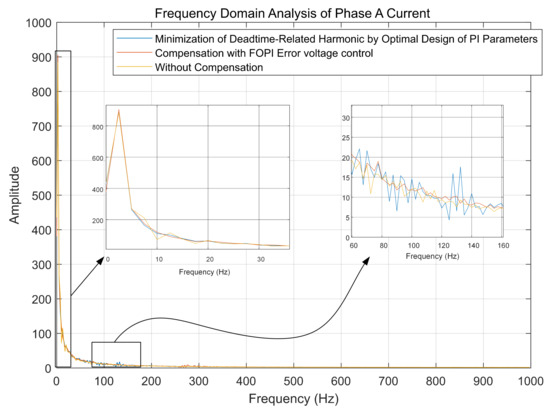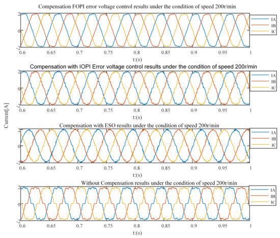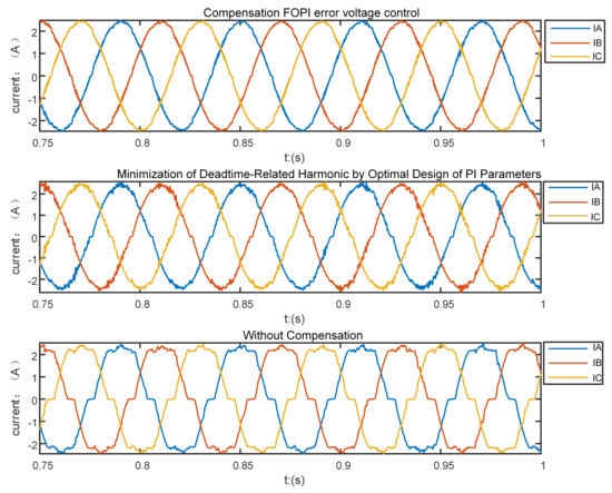In the case of keeping the motor speed constant at 200 r/min, compare the method proposed in this paper with the typical current harmonic elimination method. Observe and compare the three-phase current and its frequency spectrum. In [4], a dead-time-related harmonic minimization method based on proportional-integral (PI) controller tuning is proposed under the premise of keeping the same control strategy. In order to prove that the FOPI error voltage control method has a good ability to eliminate current harmonics, this dead-time-related harmonic minimization method [4] is compared with the proposed method.