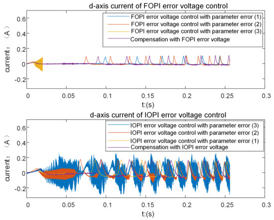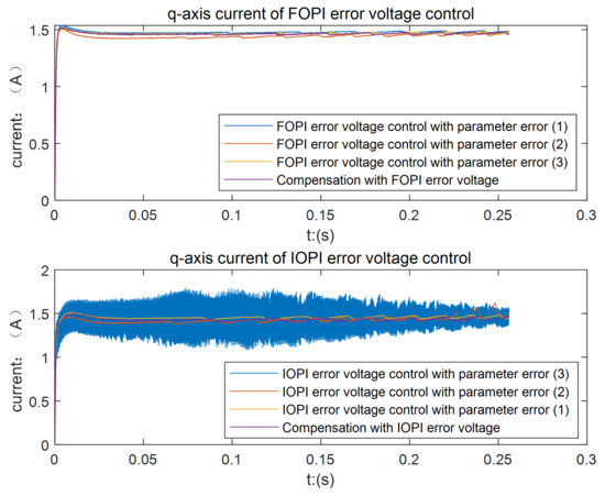 It can be seen from Figure 22 and Figure 23 that in the case of errors in motor parameters, FOPI error voltage control still has good performance in eliminating the current clamping phenomenon and suppressing high-frequency harmonic disturbances. The control effect of FOPI error voltage control is better than that of IOPI error voltage control when there are errors in motor parameters, which proves the necessity of using the FOPI controller.