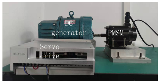 Experiments are performed under the same operating conditions as the simulation to demonstrate the effectiveness and high performance of the method with optimal FOPI control. A laboratory permanent magnet synchronous motor (PMSM) speed servo platform is shown in Figure 24. The experiments’ dead-time setting, controller, and motor parameters are consistent with the simulation. The servo drive is based on the digital signal processor (DSP) TMS320F28335, which is used for AD conversion, encoder sampling, generation of insulated-gate bipolar transistor (IGBT) gate switching signals, and control algorithm implementation.